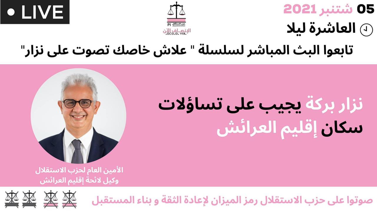 في لقاء اليوم نستضيف السيد نزار بركة الأمين العام لحزب الإستقلال ومرشح الإنتخابات التشريعية بإقليم العرائش السيد نزار بركة ننقاش معه مجموعة من المحاور يجيب بها على تساؤلات سكان العرائش .