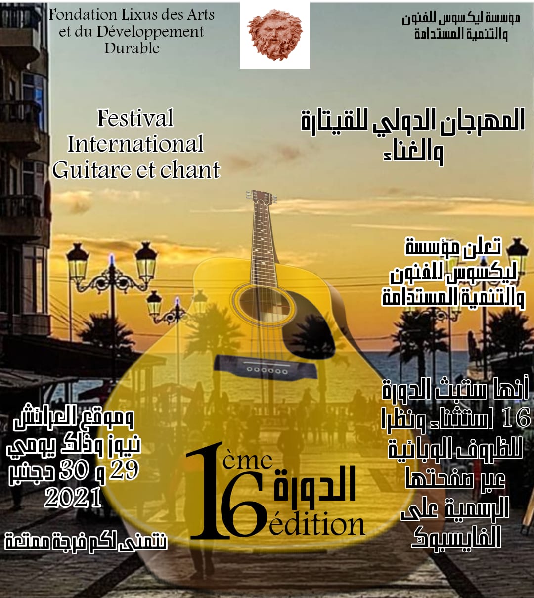 نظرا للظروف الوبائية التي تعرفها البلاد ، ستبث الدورة 16 من المهرجان الدولي للقيتارة والغناء افتراضيا كما سبقتها الدورة 15 إلى أن نضرب موعدا لاحقا مع الجمهور العرائشي في نسخة تعرف مشاركة حضورية وإلى ذلك الحين فرجة ممتعة: