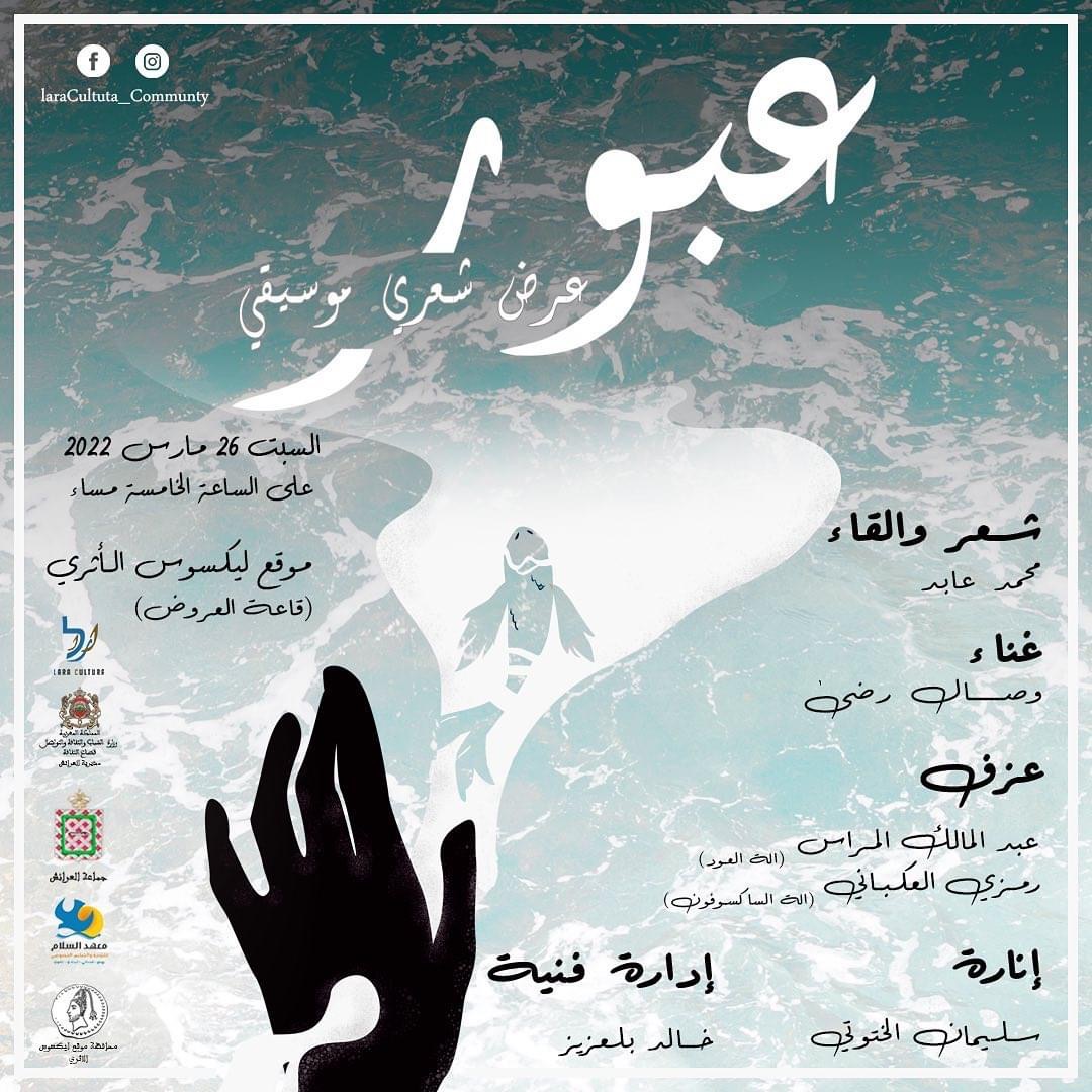 “عبور” هو عرض شعري موسيقي، يحرض على تكسير الحدود بين الفنون وتجديد حالة التلقي للخروج بها من دائرتها الضيقة والجامدة إلى آفاق أكثر شساعة ورحابة.