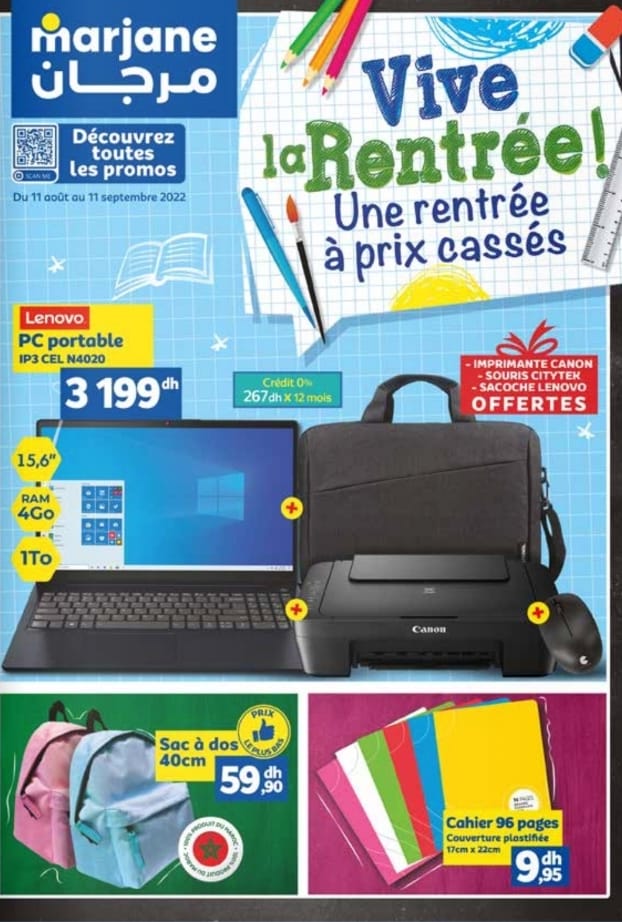 إلى غاية 11 شتنبر 2022, مرجان يوفر لكم عروضا استثنائية على كل المستلزمات المتعلقة بالدخول المدرسي. محافظ، أقلام عادية، أقلام ملونة، دفاتر، منظمات، والكل في حلة جميلة تبهر الكبار قبل الصغار، دون أن ننسى إلقاء نظرة على أروقة الملابس الخاصة بالأطفال والتي أتت بتشكيلة جديدة للاستعداد لاستقبال موسم دراسي ناجح.