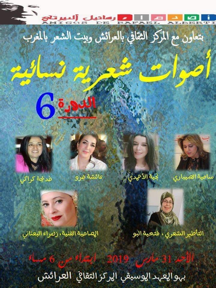جمعية أصدقاء رفائيل ألبيرتي بالتعاون مع بيت الشعر في المغرب والمركز الثقافي العرائش تنظم: أصوات شعرية نسائية – الدورة 6- وذلك يوم الأحد 31 مارس 2019 على الساعة 6 مساء، ببهو المعهد الموسيقي / المركز الثقافي العرائش بمشاركة الشاعرات: