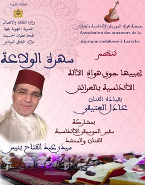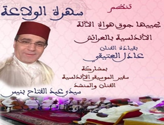 تنظم جمعية هواة الموسيقى الاندلسية بالعرائش يوم السبت 30 مارس 2019 على الساعة السابعة والنصف مساء بقاعة مسك الليل المغرب الجديد ، “سهرة الولاعة” يحييها جوق هواة اللآلة الاندلسية بالعرائش بقيادة الفنان عادل العتيقي، بمشاركة سفير الموسيقى الاندلسية الفنان والمنشد سيدي عبد الفتاح بنيس.