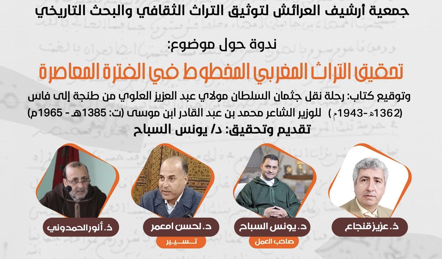 في إطار احتفالية افتتاح المركز الثقافي ليكسوس بمدينة العرائش، التي تنظمها وزارة الشباب والثقافة والتواصل -قطاع الثقافة، بشراكة مع جماعة العرائش، في الفترة المتراوحة بين 16-25 ماي 2023، وفي سياق مساهمة جمعية أرشيف العرائش في إغناء برنامج الاحتفالية عبر أنشطة تتماهى وتوجه الجمعية الرامي إلى توثيق التراث الثقافي والبحث التاريخي، واحتفاءً باليوم العالمي للتنوع الثقافي من أجل الحوار والتنمية (21 ماي)، عُقد العزم على تنظيم ندوة حول موضوع: “تحقيق التراث المغربي المخطوط في الفترة المعاصرة” وتوقيع كتاب: رحلة نقل جثمان السلطان مولاي عبد العزيز العلوي من طنجة إلى فاس (1362-1943) للوزير الشاعر محمد بن عبد القادر ابن موسى (ت: 1385هـ – 1965م)، تحقيق: د. يونس السباح.