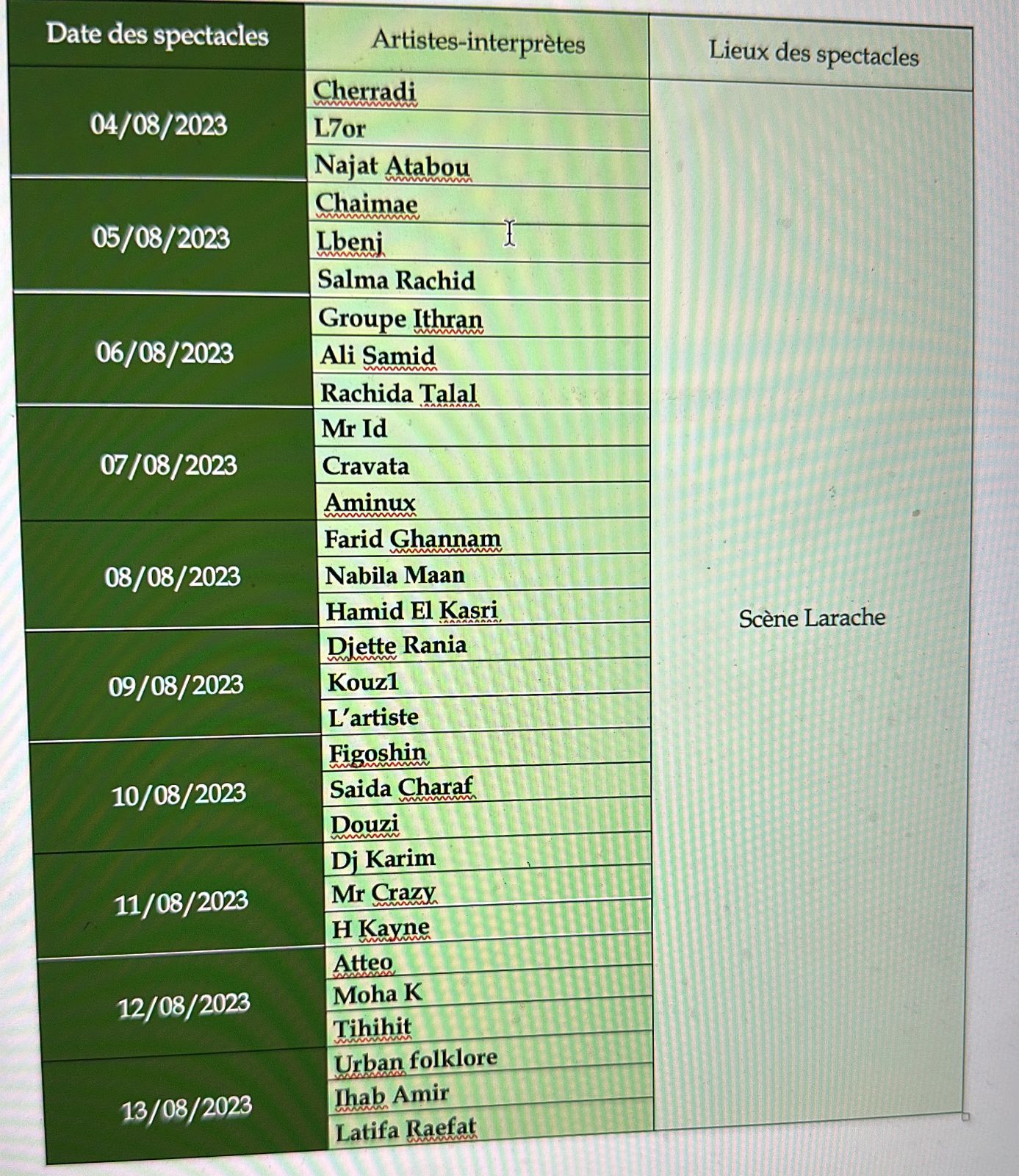 و سيحيي المهرجان مجموعة من أشهر الفنانين المغاربة ( سلمى رشيد، دوزي ،حميد القصري ، فريد غنام، سعيدة شرف، لطيفة رأفة، ونحاة عتابو …) و العالميين ( L’Artiste, Mr crazy, Figoshin, Mohamed k, Kouz 1, …)