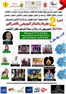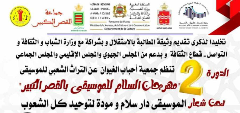 تخليدا لذكرى تقديم وثيقة المطالبة بالإستقلال، وبشراكة مع وزارة الشباب والثقافة والتواصل -قطاع الثقافة- وبدعم من المجلس الجهوي و المجلس الإقليمي، تنظم جمعية أحباب الغيوان عن التراث الشعبي للموسيقى، مهرجان السلام للموسيقى في دورته الثانية تحت شعار “ الموسيقى دار سلام ومودة لتوحيد كل الشعوب “وذلك أيام الجمعة والسبت والأحد الموافق ل 12_13_14 من شهر يناير الجاري، بالقاعة الكبرى لبلدية القصر الكبير، حسب البرنامج التالي: