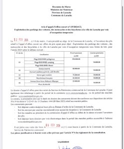 اصدرت جماعة العرائش اعلانا عن طلب عروض مفتوح رقم : 2024/1/ ج.ع لمنح الاستغلال المؤقت للملك العمومي بواسطة محطات وقوف السيارات والدراجات النارية والعادية بجماعة العرائش.