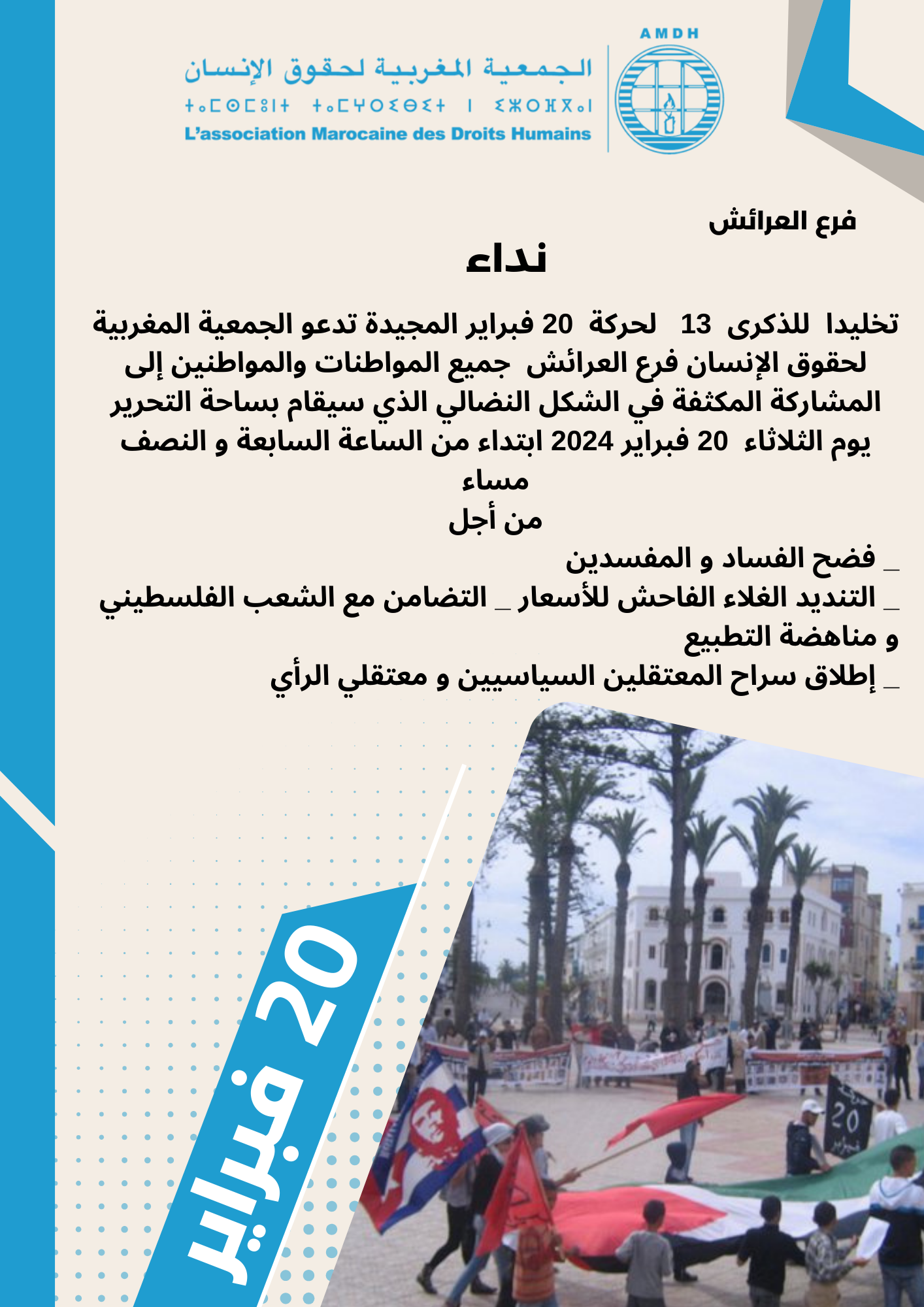 دعت الجمعية المغربية لحقوق الإنسان بالعرائش، في نداء لها إلى تخليد الذكرى 13 للحركة السياسية 20 فبراير. وعبرت الجمعية في ندائها إلى المشاركة المكثفة في الشكل النضالي الذي سيقام بساحة التحرير يوم غد الثلاثاء 20 فبراير 2024 ابتداء من الساعة السابعة و النصف مساء.