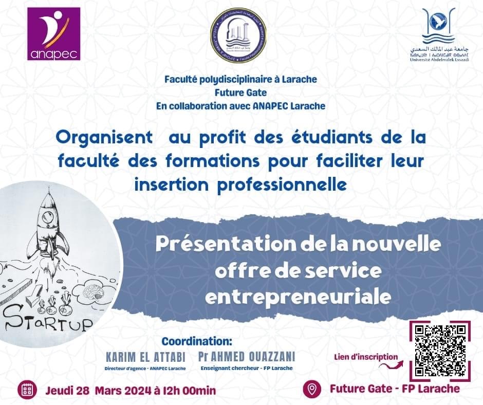 تنظم بوابة المستقبل التابعة للكلية متعددة التخصصات بالعرائش بشراكة مع وكالة ANAPEC دورات تكوينية متخصصة في المواكبة المقاولاتية لتقديم بعض الخدمات التي يمكن أن يستفيد منها الشباب حاملي المشاريع.