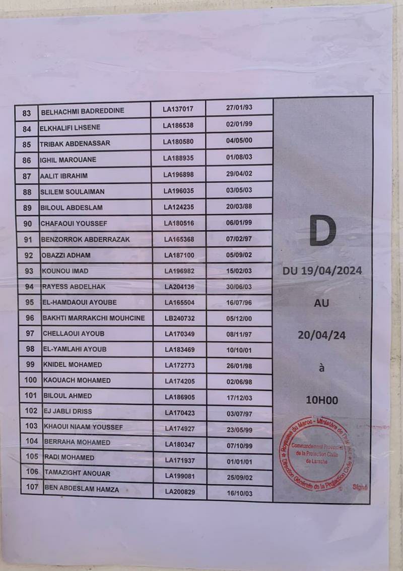 أعلنت القيادة الإقليمية للوقاية المدنية بالعرائش عن اللائحة الأولية لأسماء الناجحين في اختبارات السباحة، و طالبت القيادة من المترشحين المدرجة أسمائهم في اللوائح أسفله الحضور إلى تكنة الوقاية المدنية بالعرائش، وذلك من أجل الخضوع لدورة تكوينة في الإسعافات الأولية والطرق التي يجب سلوكها للوصول إلى الغريق..