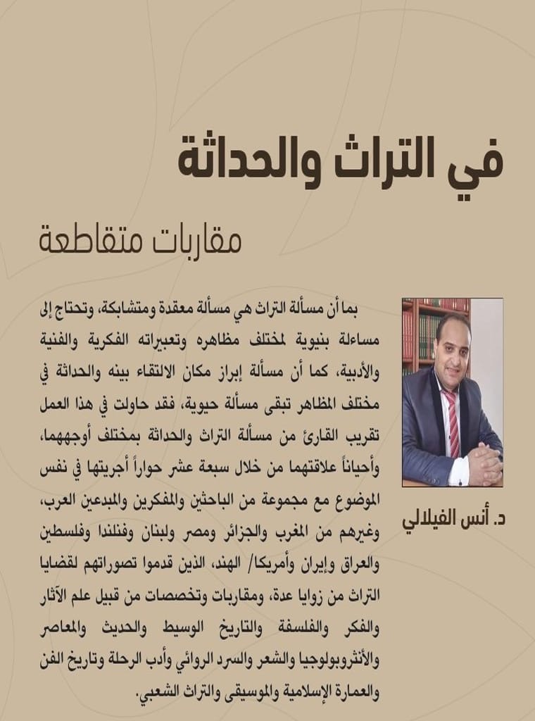 وعن محتويات هذا العمل الحواري أبرز الدكتور أنس الفيلالي” بما أن مسألة التراث هي مسألة معقدة ومتشابكة وتحتاج إلى مساءلة بنيوية لمختلف مظاهره وتعبيراته الفكرية والفنية والأدبية، كما أن مسألة إبراز مكان الالتقاء بينه وبين الحداثة في مختلف المظاهر تبقى مسألة حيوية، فقد حاولت في هذا العمل تقريب القارئ من مسألة التراث والحداثة بمختلف أوجهما وأحيانا علاقتهما من خلال سبعة عشرة حوارا أجريته في نفس الموضوع مع مجموعة من الباحثين والمفكرين والمبدعين العرب وغيرهم من المغرب والجزائر ومصر ولبنان وفنلندا وفلسطين والعراق وسوريا وإيران وأمريكا / الهند، الذين قدموا تصوراتهم لقضايا التراث من عدة زوايا ومقاربات وتخصصات من قبيل علم الآثار والفكر والفلسفة والتاريخ الوسيط والحديث والمعاصر والأنتروبولوجيا والشعر و السرد الروائي وأدب الرحلة وتاريخ الفن والعمارة الإسلامية والموسيقى والتراث الشعبي.”