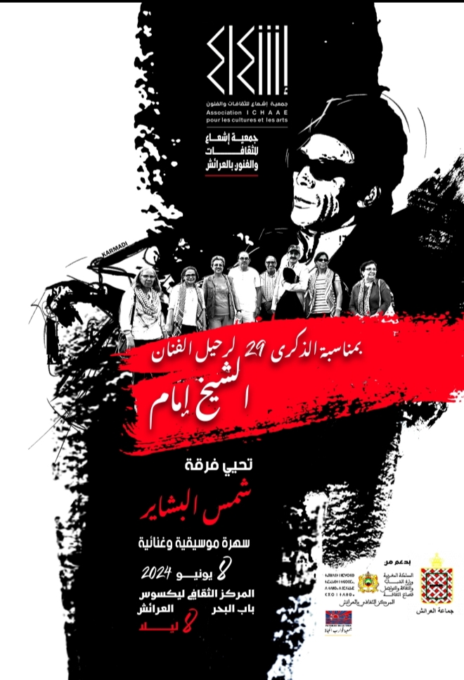 بمناسبة الذكرى 29 لرحيل الفنان الشيخ إمام، تنظم جمعية إشعاع للثقافات والفنون بالعرائش سهرة موسيقية وغنائية، بدعم من جماعة العرائش والمركز الثقافي بالعرائش وجمعية قوارب الحياة، تحييها فرقة شمس البشاير من مدينة مراكش التي أخذت على عاتقها استعادة وإحياء التراث الغنائي للشيخ إمام الذي ألهبت أغانيه جماهير عريضة من المحيط إلى الخليج، هذه الأغاني التي تنتصر وتنحاز للقضايا العادلة للإنسان .
