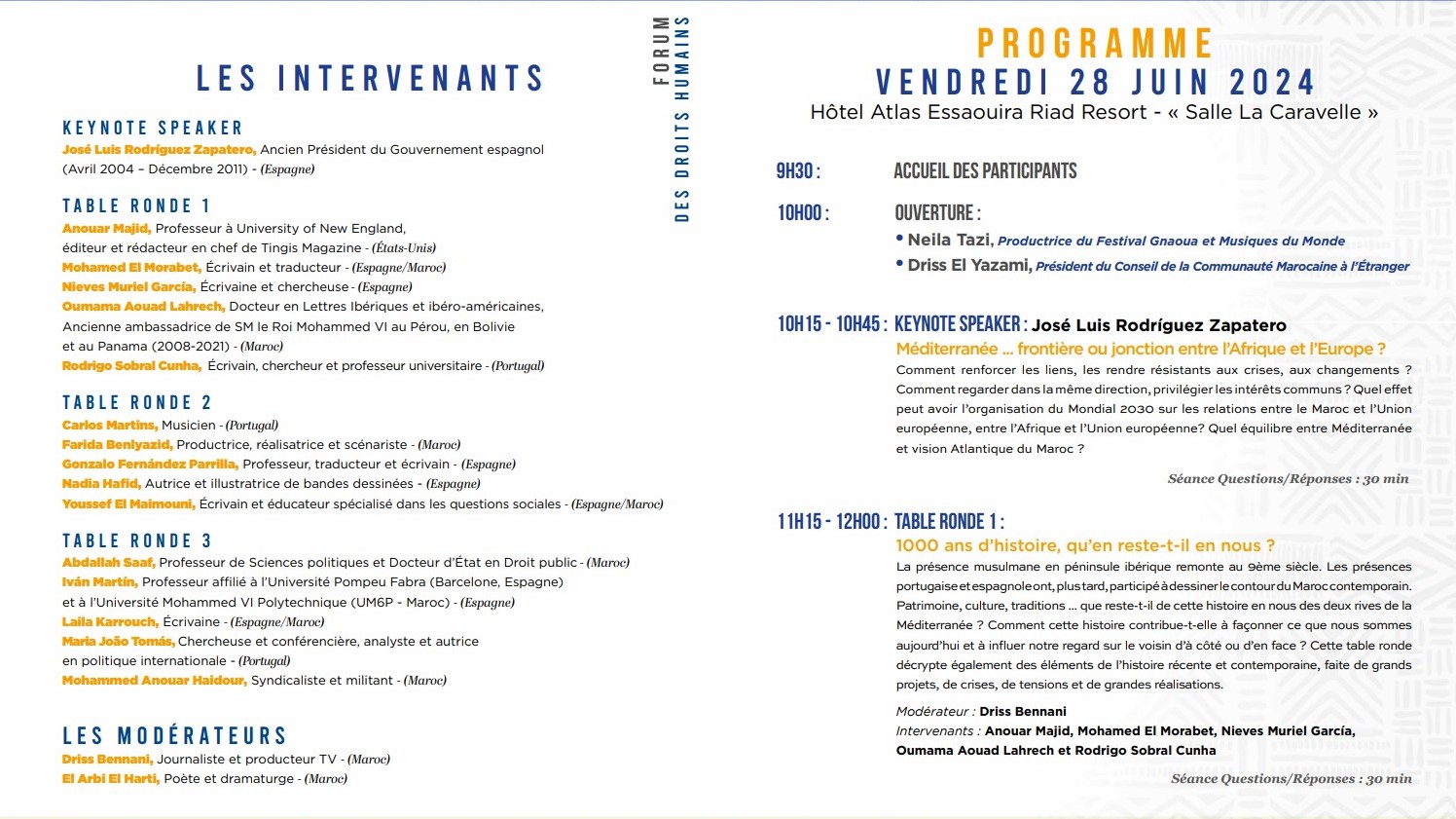 وأفاد بيان للمنظمين أن هذا المنتدى، الذي يُنظم بالتعاون مع مجلس الجالية المغربية بالخارج، يستضيف في كل دورة شخصيات من خلفيات متنوعة لمناقشة بحرية ثلاثة محاور موضوعية، بالإضافة إلى كلمة افتتاحية يلقيها رئيس الحكومة الإسبانية السابق، خوسيه لويس رودريغيز ثاباتيرو.