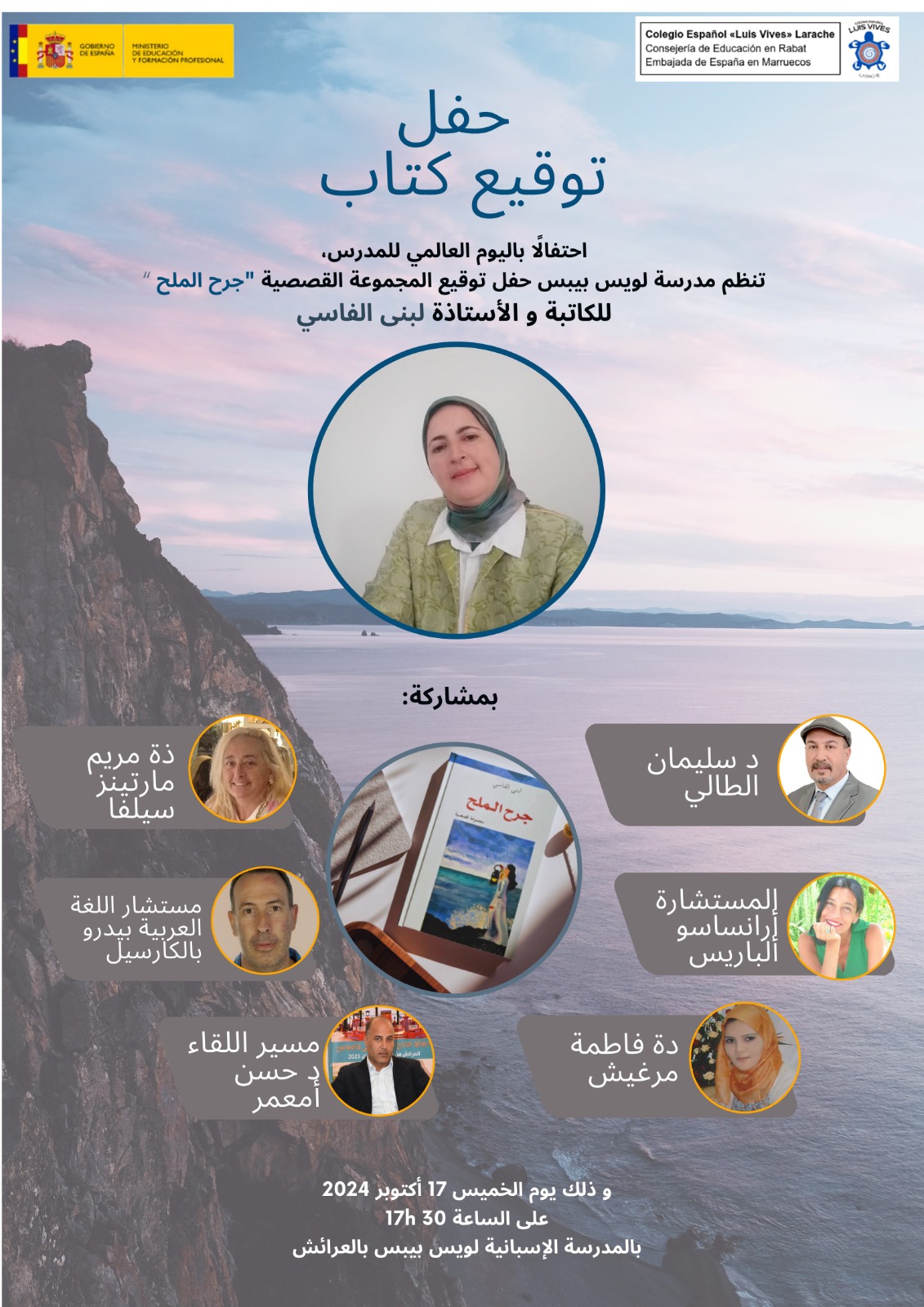 الحفل شهد حضور شخصيات بارزة في المجال الثقافي والتعليمي، من بينهم مدير المؤسسة الأستاذ مانويل سانشيز خيمينيز، والمفتش التربوي للغة العربية بيدرو فالكارسل، والمستشارة أرانساسو ألفاريز ممثلةً عن مستشارية التعليم بالسفارة الإسبانية في الرباط، إلى جانب الفنانة التشكيلية مريم مارتينيز سيلفا، الأستاذة السابقة في مؤسسة لويس فيفيس، والتي أبدعت في رسم اللوحة الرمزية التي تزين غلاف المجموعة. أدار الندوة الأستاذ حسن أمعمار بمهارة وتبصر.