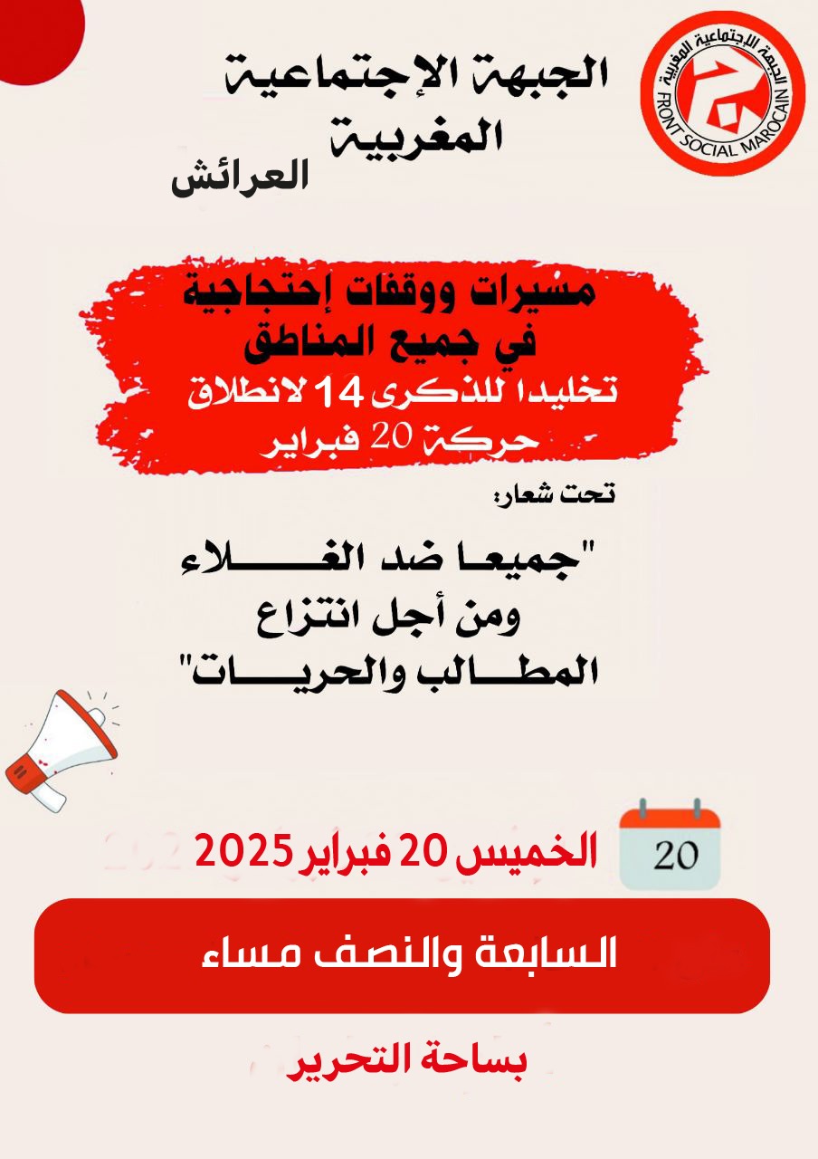 تعتزم الجبهة الاجتماعية المغربية بمدينة العرائش تنظيم مسيرة ووقفة احتجاجية يوم الخميس 20 فبراير 2025، تخليدا للذكرى الرابعة عشرة لانطلاق حركة 20 فبراير، التي شكلت محطة بارزة في النضال من أجل الديمقراطية والعدالة الاجتماعية بالمغرب.
