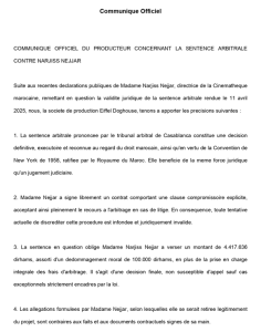 وبحسب الحكم الصادر في 11 أبريل 2025، فإن نرجس النجار مطالبة بدفع 4.417.636 درهمًا، إضافة إلى تعويض معنوي قدره 100.000 درهم، وتحمل كامل مصاريف التحكيم، في قرار نهائي وملزم، يستند إلى القوانين المغربية واتفاقية نيويورك لسنة 1958.