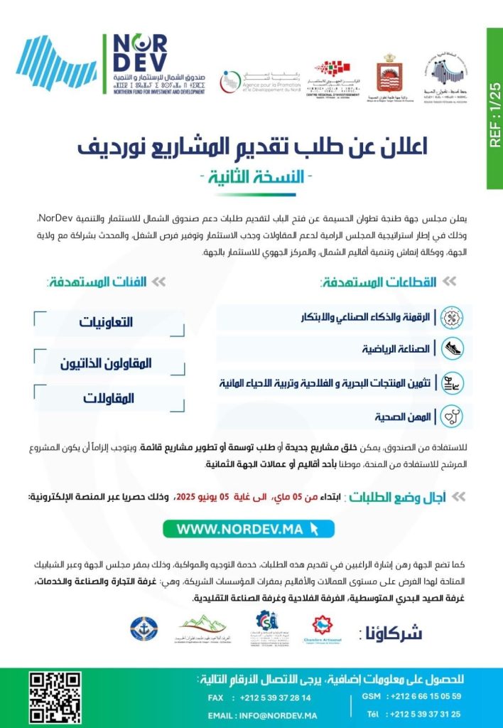 إعلان عن النسخة الثانية من فتح باب تقديم طلبات الدعم إلى صندوق الشمال للاستثمار والتنمية “نورديف” – جهة طنجة-تطوان-الحسيمة.