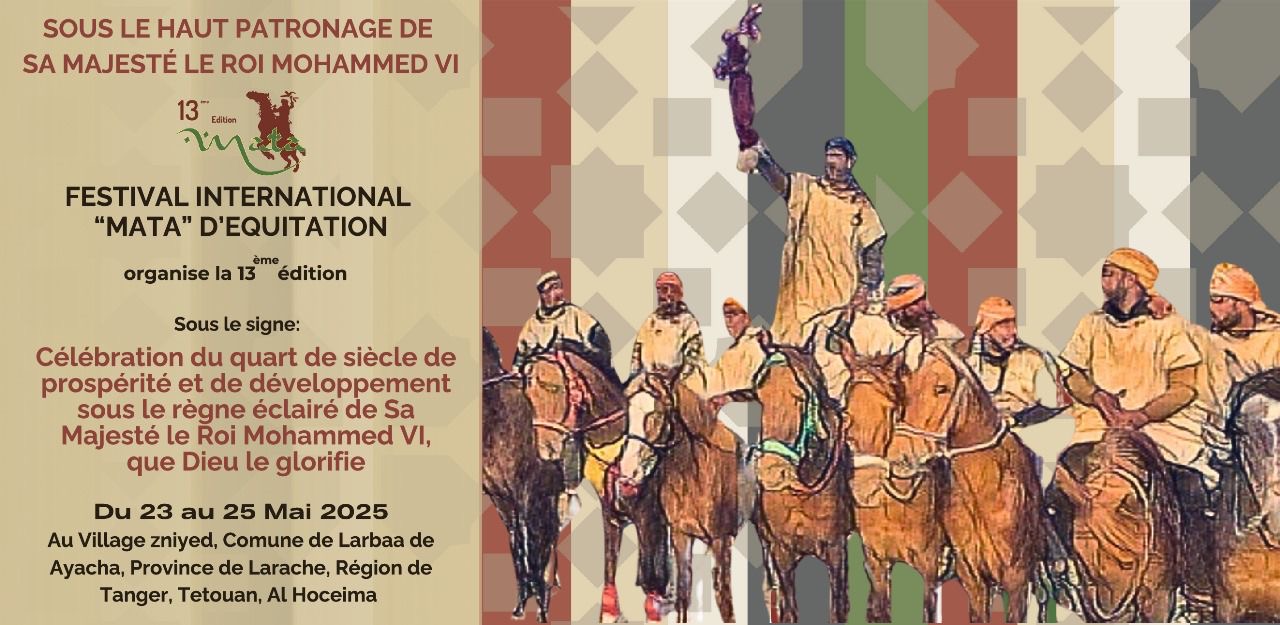 تحت الرعاية السامية لصاحب الجلالة الملك محمد السادس نصره الله وأيده، يعود المهرجان الدولي “ماطا” للفروسية ليضرب لجمهوره الكبير موعدا جديدا في دورة استثنائية، من يوم الجمعة 23 ماي إلى غاية الأحد 25 ماي 2025، وذلك بمدشر زنيد جماعة أربعاء عياشة دائرة مولاي عبد السلام ابن مشيش بإقليم العرائش، ولاية طنجة تطوان الحسيمة.