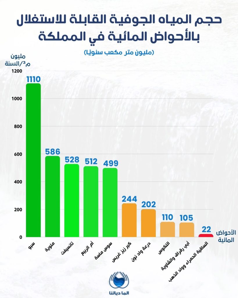 فقد سُجل بالحوض المائي سبو أعلى حجم من المياه الجوفية القابلة للاستغلال، يصل إلى 1110 مليون متر مكعب سنويًا. ويليه الحوض المائي ملوية بـ586 مليون متر مكعب، ثم الحوض المائي تانسيفت بـ528 مليون متر مكعب،متبوعًا بالحوض المائي أم الربيع بـ 512 مليون متر مكعب، وسوس ماسة بـ 499 مليون متر مكعب.