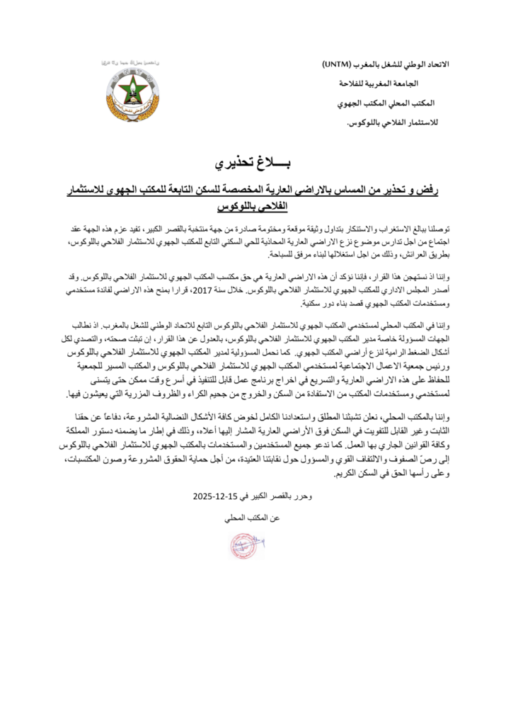 في تصعيد واضح للخلاف حول أراضٍ مخصصة للسكن، أعلن المكتب المحلي لمستخدمي المكتب الجهوي للاستثمار الفلاحي باللوكوس، التابع للاتحاد الوطني للشغل بالمغرب، رفضه القاطع لأي مساس بالأراضي العارية المحاذية للحي السكني التابع للمكتب بطريق العرائش، محذراً من أي محاولة لنزع ملكيتها أو تحويل غرضها.