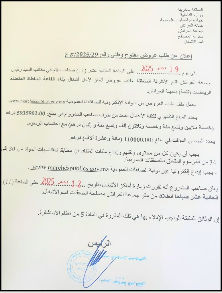 · فتح الأظرفة: من المقرر فتح الأظرفة الخاصة بالعروض المقدمة في مقر جماعة العرائش، تحت إشراف السيد رئيس الجماعة، وذلك يوم (يُحدد لاحقًا) على الساعة الحادية عشر صباحًا (11:00).