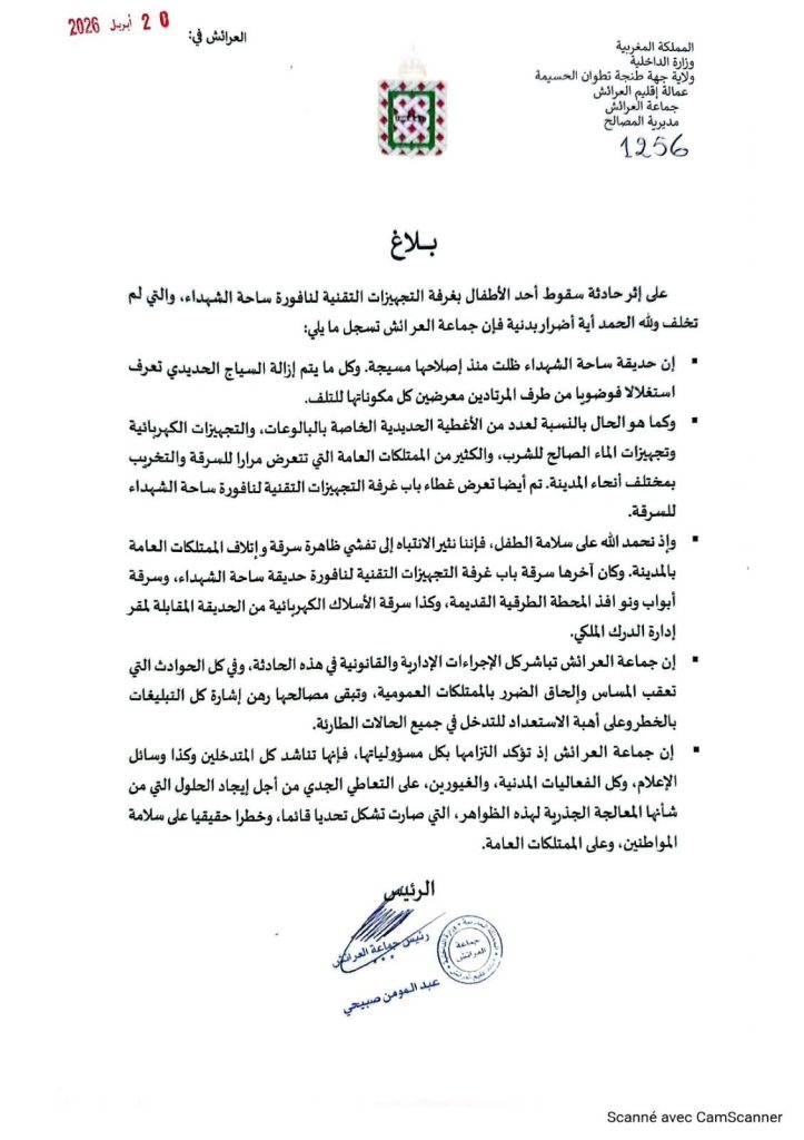 وبينما حمدت الجماعة الله على سلامة الطفل، أكدت أنها تباشر كل الإجراءات الإدارية والقانونية في هذه الحادثة وجميع الحوادث المتعلقة بالمساس بالممتلكات العمومية، مشددة على أن مصالحها تبقى رهن إشارة كل التبليغات بالخطر وعلى أهبة الاستعداد للتدخل في جميع الحالات الطارئة.