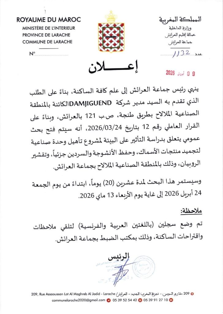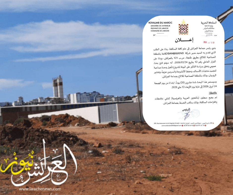 في إطار حرصها على مبادئ الشفافية والمشاركة المواطنة، أعلنت جماعة العرائش، بناءً على طلب شركة DAMJIGUEND وقرار عاملي، عن فتح بحث عمومي يمتد لعشرين يوماً حول مشروع صناعي جديد بالمنطقة الصناعية الملالاح.