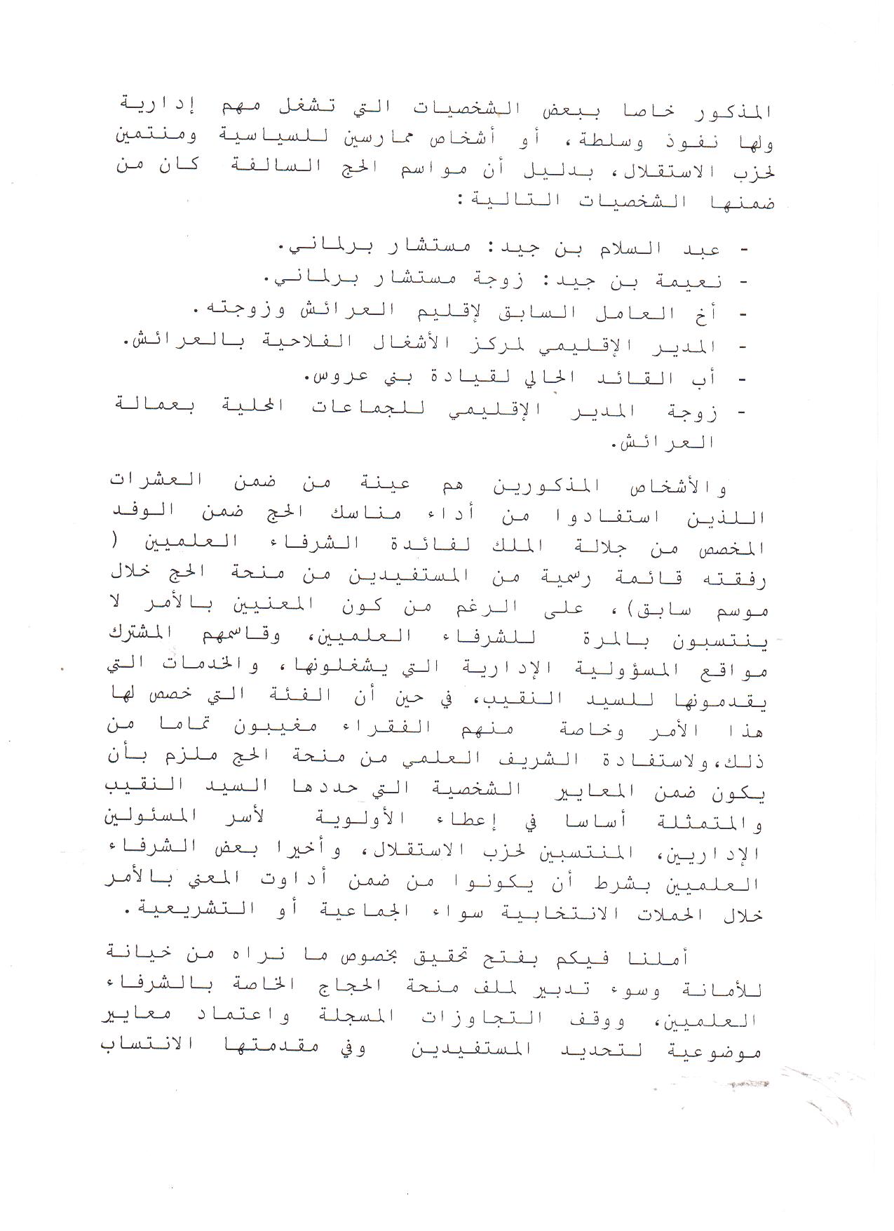 من جانب آخر، كشفت الشكاية أن الأشخاص المذكورين، هم فقط “عينة من ضمن العشرات الذين استفادوا من أداء مناسك الحج ضمن الوفد المخصص من الملك، لفائدة الشرفاء العلميين”. وأرفقت الشكاية قائمة وصفتها ب”الرسمية” قالت أنها أسماء المستفيدين من منحة الحج خلال موسم سابق”، رغم أن المعنيين بالأمر حسب ذات الشكاية “لا ينتسبون بالمرة للشرفاء العلميين، وقاسمهم المشترك مواقع المسؤولية الإدارية التي يشغلونها، والخدمات التي يقدمونها للنقيب”، في حين أن الفئة التي خصص لها هذا الأمر تخلص الشكاية “هم الفقراء” الذين تم تغييبهم تماما من الشرفاء العلميين.
