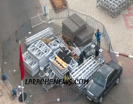 عاينت العرائش نيوز المعدات التي وصلت أمس الأربعاء 2014/07/30 ليلا إلى مدينة العرائش، و هي عبارة عن منصة احترافية مفككة سيتم نصبها بساحة التحرير ضمن إحدى الأماكن المخصصة لسهرات مهرجان عبد الصمد الصَّمد الكنفاوي و الذي سيمتدٌّ من 2 إلى 8 غشت 2014.