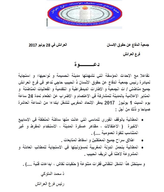دعت جمعية الدفاع عن حقوق الانسان فرع العرائش جميع مناضليها الى المشاركة في الاعتصام والاضراب عن الطعام لمدة 24 ساعة، وذلك يوم السبت 1 يوليوز 2017 بمقر الاتحاد المغربي للشغل ابتداء من الساعة العاشرة صباحا.