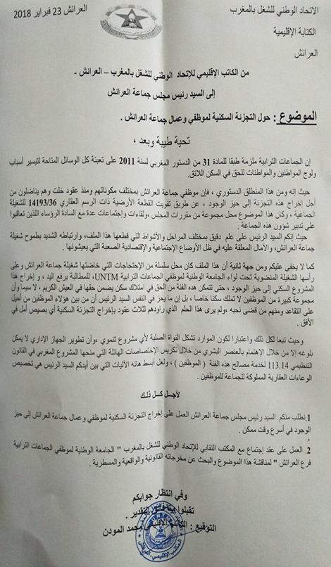 الكاتب الإقليمي للاتحاد الوطني للشغل يراسل رئيس جماعة العرائش بخصوص سكن موظفي وعمال جماعة العرائش