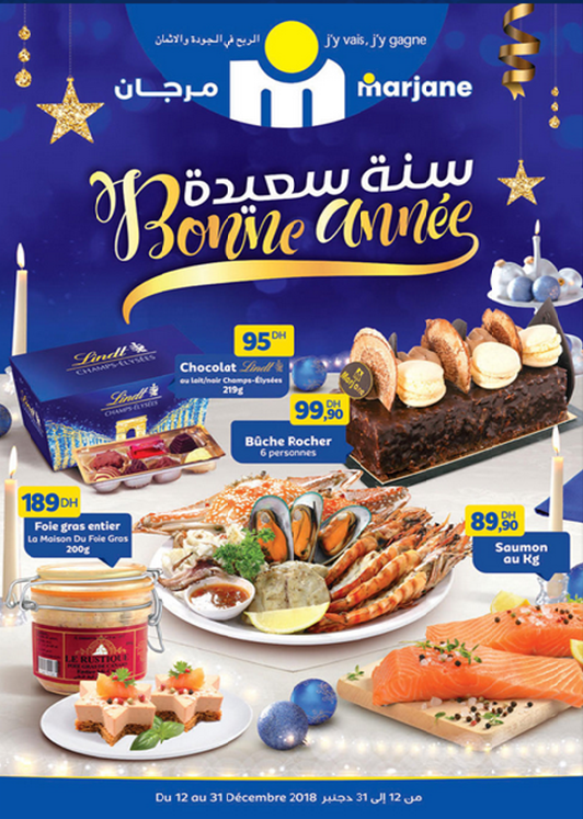 بمناسبة حلول السنة الجديدة، و من 12 إلى 31 دجنبر 2018، مرجان يقدّم لكم أحسن العروض…اقضوا أحسن الأوقات، و قدّموا أجمل الهدايا إلى أحبائكم…أروقتنا رهن إشارتكم…أدوات منزلية، تجهيزات إلكترونية، مواد تجميل، ملابس و لعب للأطفال، مواد غذائية خاصة بناسبة نهاية السنة…استقبلوا العام الجديد مع منتوجات مرجان.